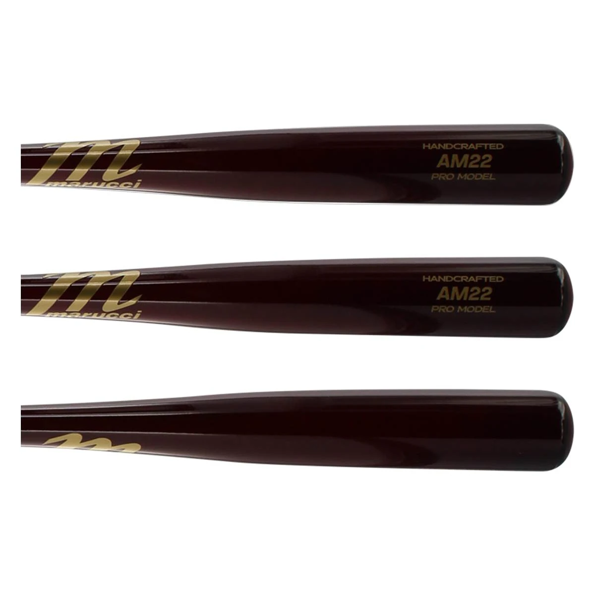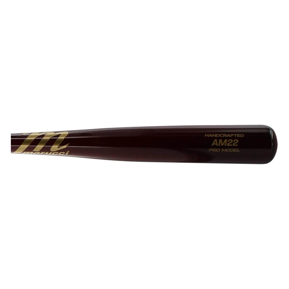 This AM22 model of Marucci bat is built with a medium thickness barrel and handle. The end result is a well-balanced bat that still can feature a decent-sized barrel. On the handle end, the bat is bottomed off with a flared knob (pretty decent flare to be honest!). In addition, this bat is going to feature the MLB Ink Dot test so you know it is constructed from some top-tier maple wood. And if all of these features weren’t enough, you’ll be put over the edge by the cherry color of the bat!